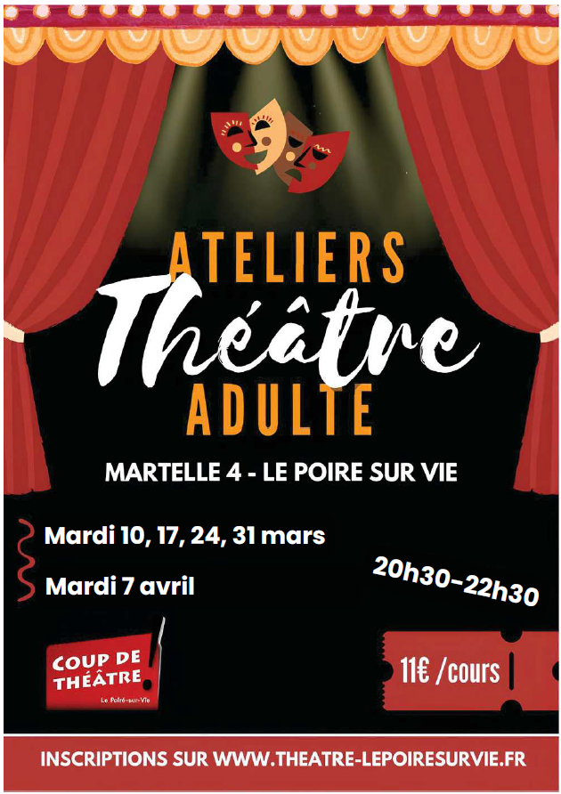 Coup de Théâtre propose 5 ateliers théâtraux pour adultes sur mars et avril, encadré par Romain Bonnet, comédien, metteur en scène et animateur de l’association. Venez goûter à la pratique théâtrale de façon ludique autour de jeux théâtraux, dans une ambiance conviviale et détendue. Ateliers ouverts à tous, de 10 à 12 personnes maximum. Tarif : 11€/atelier Ces ateliers se dérouleront le mardi soir de 20h30 à 22h30 – salle Martelle 4. Voici les dates : Mardi 10 mars, 17 mars, 24 mars, 31 mars Mardi 7 avril Inscription via helloasso en cliquant ici Inscription au plus tard le jeudi précédant l’atelier. N’hésitez pas à participer à un atelier pour découvrir !
